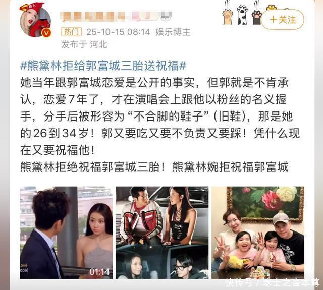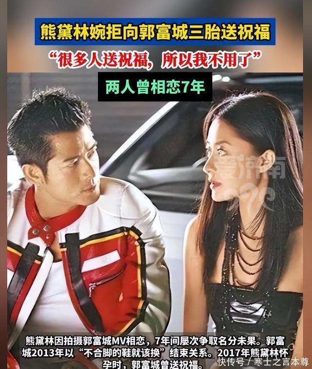熊黛林拒绝送祝福 这边郭富城家喜气洋洋,另一边前女友熊黛林的回应又引起了网友热议。 有记者在采访的时候直接贴脸开大,问熊黛林对郭富城三胎的事情怎么看,还顺势邀请她送祝福。