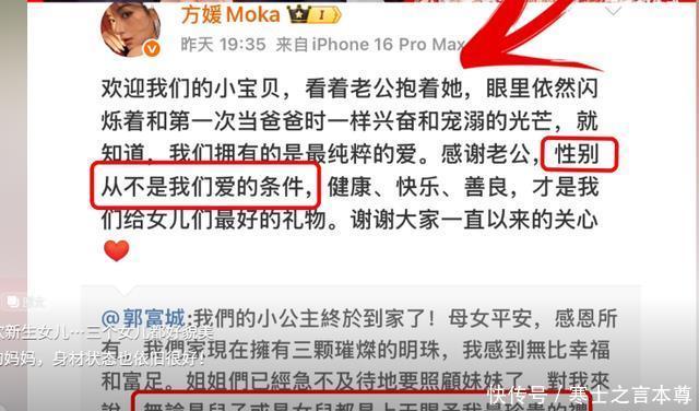方媛三胎又生女 10号,59岁的郭富城一条官宣微博直接炸了热搜: “我们的小公主终于到家了!母女平安,感恩所有”。 这本该是阖家欢喜的好事,却因为“三胎再得女”的结果,被网友扒出一堆争议。 这波三胎热度,其实早在半年前就已经开始传个不停了。